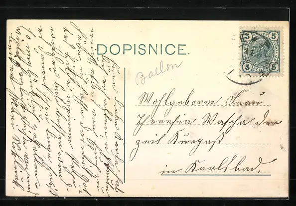 Personenbezogene Daten auf der Rückseite der Karte wurden durch blauen Textmarker unkenntlich gemacht. Die blauen Stellen sind auf die Vorderseite durchgeweicht und wirken sich negativ auf das Postkartenfoto aus