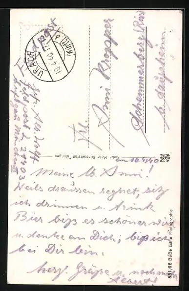 alte Ansichtskarte, gelaufen 1940, Bugspur Ecke re. oben, Stecknadellöcher li. oben, guter Zustand