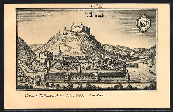AK Urach /Württemberg, Ortsansicht im Jahre 1663 nach Merian