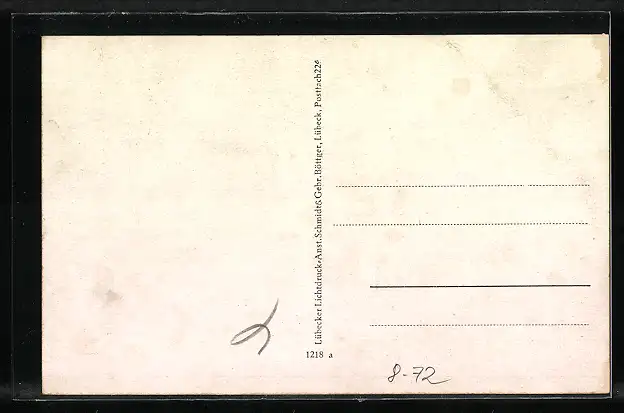 Personenbezogene Daten auf der Rückseite der Karte wurden durch blauen Textmarker unkenntlich gemacht. Die blauen Stellen sind auf die Vorderseite durchgeweicht und wirken sich negativ auf das Postkartenfoto aus