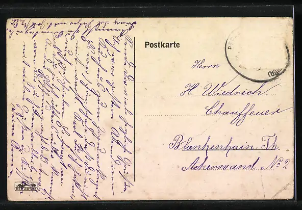 Personenbezogene Daten auf der Rückseite der Karte wurden durch blauen Textmarker unkenntlich gemacht. Die blauen Stellen sind auf die Vorderseite durchgeweicht und wirken sich negativ auf das Postkartenfoto aus