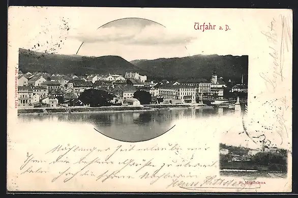 AK Urfahr a. D., Uferpartie mit Kirche, Ortspartie