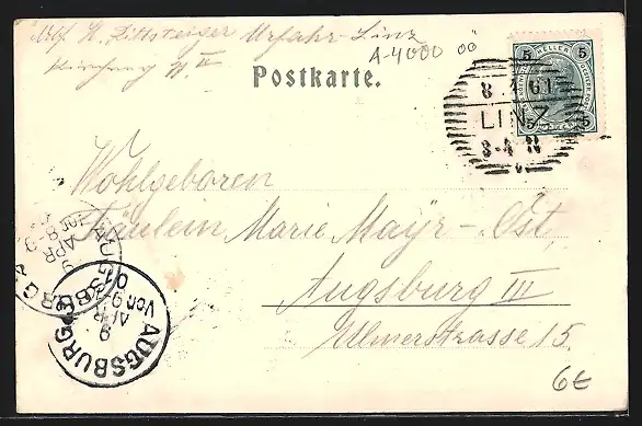 gelaufen 1901, Eckknicke re., Stempelspur, guter Zustand