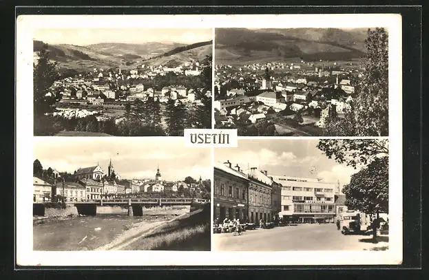 AK Usetin, Teilansicht, Strassenpartie mit Sparkasse, Brücke