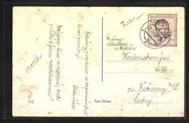 Personenbezogene Daten auf der Rückseite der Karte wurden durch blauen Textmarker unkenntlich gemacht. Die blauen Stellen sind auf die Vorderseite durchgeweicht und wirken sich negativ auf das Postkartenfoto aus