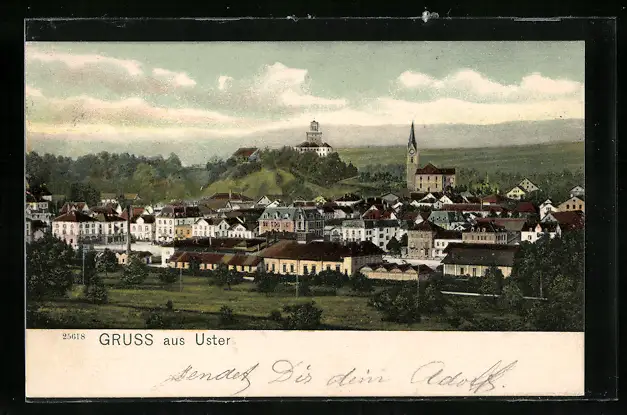 AK Uster, Ortsansicht mit Fabrik und Kirche