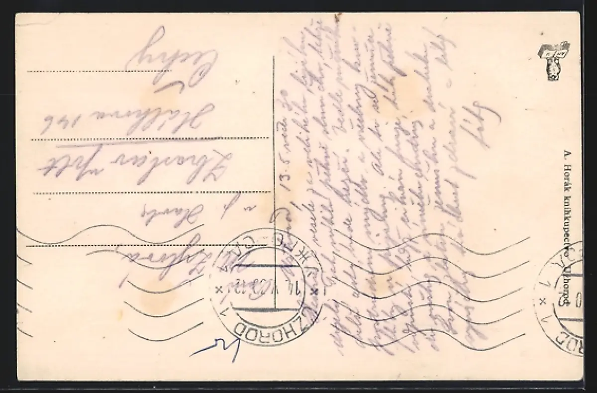 Personenbezogene Daten auf der Rückseite der Karte wurden durch blauen Textmarker unkenntlich gemacht. Die blauen Stellen sind auf die Vorderseite durchgeweicht und wirken sich negativ auf das Postkartenfoto aus
