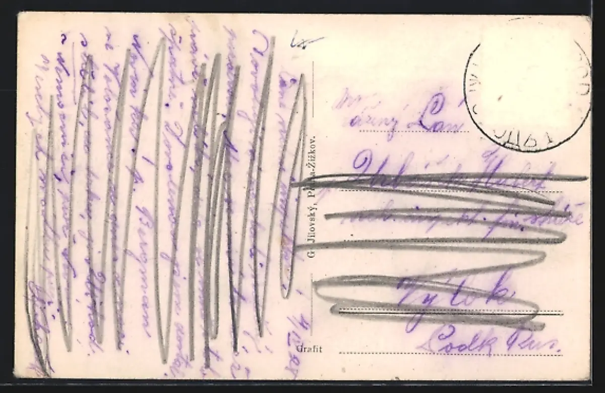 Personenbezogene Daten auf der Rückseite der Karte wurden durch blauen Textmarker unkenntlich gemacht. Die blauen Stellen sind auf die Vorderseite durchgeweicht und wirken sich negativ auf das Postkartenfoto aus