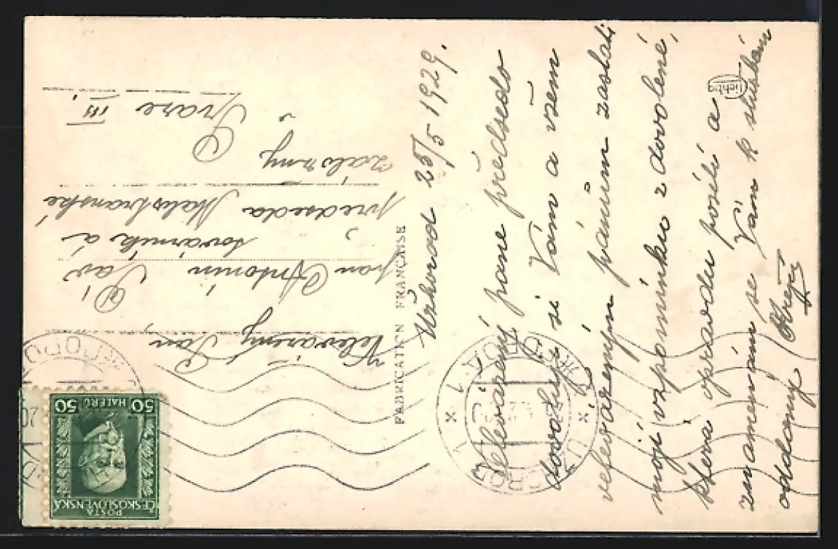 Personenbezogene Daten auf der Rückseite der Karte wurden durch blauen Textmarker unkenntlich gemacht. Die blauen Stellen sind auf die Vorderseite durchgeweicht und wirken sich negativ auf das Postkartenfoto aus