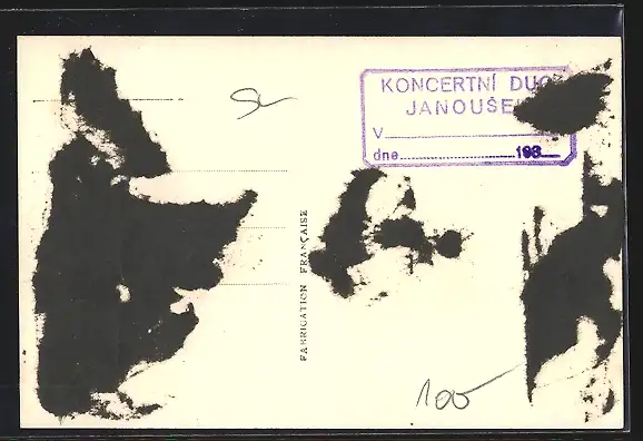 Personenbezogene Daten auf der Rückseite der Karte wurden durch blauen Textmarker unkenntlich gemacht. Die blauen Stellen sind auf die Vorderseite durchgeweicht und wirken sich negativ auf das Postkartenfoto aus