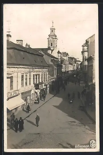 AK Uzhorod, Strassenpartie mit Geschäften und Kirche aus der Vogelschau