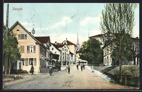 AK Uznach, Strassenpartie mit Blick auf den Kirchturm