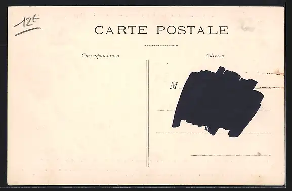 Personenbezogene Daten auf der Rückseite der Karte wurden durch blauen Textmarker unkenntlich gemacht. Die blauen Stellen sind auf die Vorderseite durchgeweicht und wirken sich negativ auf das Postkartenfoto aus