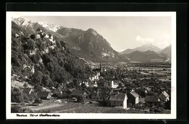 AK Vaduz / Liechtenstein, Totalansicht mit Kirche, Umgebung, Gebirge
