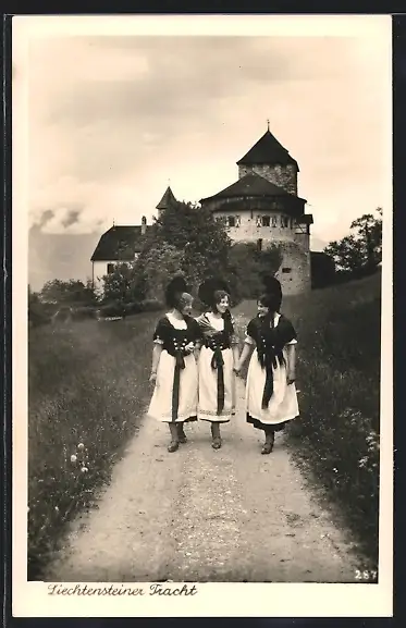 AK Vaduz, Schloss und drei Frauen in Liechtensteiner Tracht