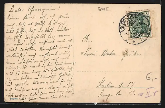 gelaufen 1915, Eckknick li. unten und re. oben, Bugspur rechts unten, guter Zustand