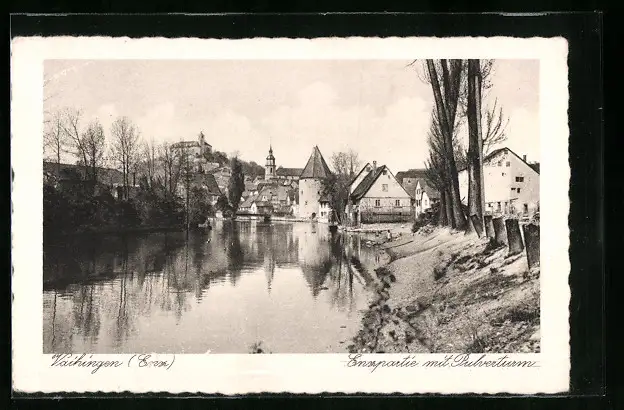 AK Vaihingen /Enz, Enzpartie mit Pulverturm