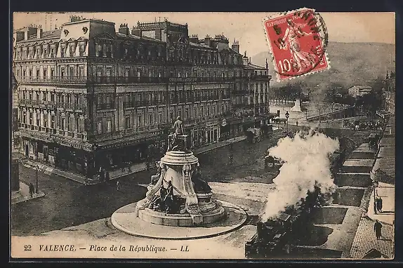 AK Valence, Place de la République avec fontaine et bâtiment imposant