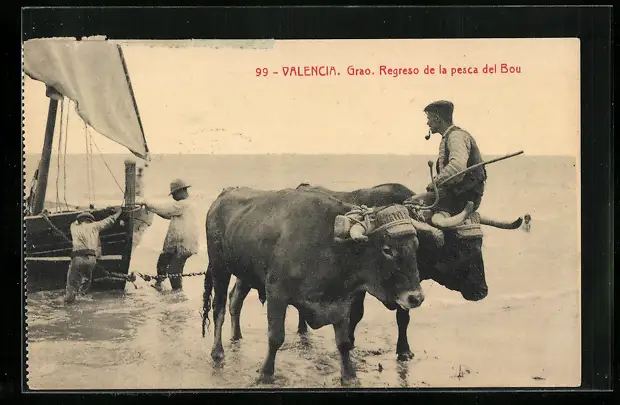 AK Valencia, Angespannte Ochsen vor einem anlegenden Fischerboot