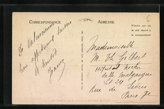 Personenbezogene Daten auf der Rückseite der Karte wurden durch blauen Textmarker unkenntlich gemacht. Die blauen Stellen sind auf die Vorderseite durchgeweicht und wirken sich negativ auf das Postkartenfoto aus