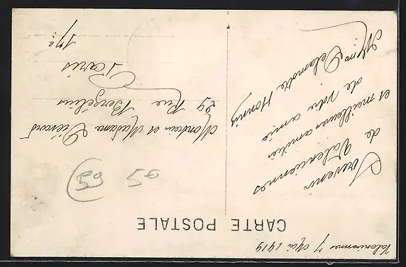 Personenbezogene Daten auf der Rückseite der Karte wurden durch blauen Textmarker unkenntlich gemacht. Die blauen Stellen sind auf die Vorderseite durchgeweicht und wirken sich negativ auf das Postkartenfoto aus