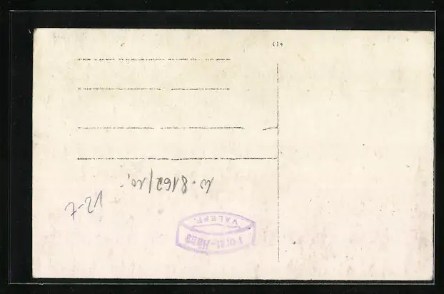 Personenbezogene Daten auf der Rückseite der Karte wurden durch blauen Textmarker unkenntlich gemacht. Die blauen Stellen sind auf die Vorderseite durchgeweicht und wirken sich negativ auf das Postkartenfoto aus