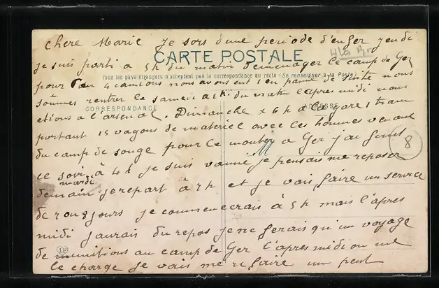 Personenbezogene Daten auf der Rückseite der Karte wurden durch blauen Textmarker unkenntlich gemacht. Die blauen Stellen sind auf die Vorderseite durchgeweicht und wirken sich negativ auf das Postkartenfoto aus