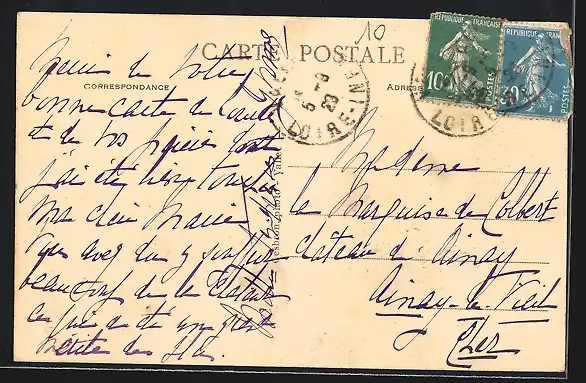Personenbezogene Daten auf der Rückseite der Karte wurden durch blauen Textmarker unkenntlich gemacht. Die blauen Stellen sind auf die Vorderseite durchgeweicht und wirken sich negativ auf das Postkartenfoto aus