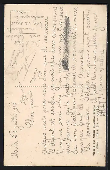 Personenbezogene Daten auf der Rückseite der Karte wurden durch blauen Textmarker unkenntlich gemacht. Die blauen Stellen sind auf die Vorderseite durchgeweicht und wirken sich negativ auf das Postkartenfoto aus
