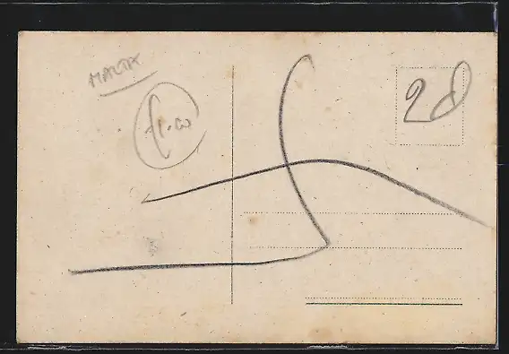 Personenbezogene Daten auf der Rückseite der Karte wurden durch blauen Textmarker unkenntlich gemacht. Die blauen Stellen sind auf die Vorderseite durchgeweicht und wirken sich negativ auf das Postkartenfoto aus