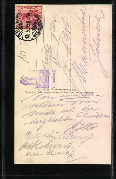 Personenbezogene Daten auf der Rückseite der Karte wurden durch blauen Textmarker unkenntlich gemacht. Die blauen Stellen sind auf die Vorderseite durchgeweicht und wirken sich negativ auf das Postkartenfoto aus