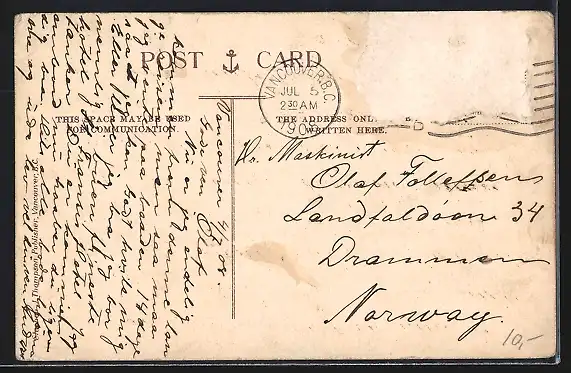 Personenbezogene Daten auf der Rückseite der Karte wurden durch blauen Textmarker unkenntlich gemacht. Die blauen Stellen sind auf die Vorderseite durchgeweicht und wirken sich negativ auf das Postkartenfoto aus