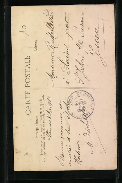 Personenbezogene Daten auf der Rückseite der Karte wurden durch blauen Textmarker unkenntlich gemacht. Die blauen Stellen sind auf die Vorderseite durchgeweicht und wirken sich negativ auf das Postkartenfoto aus