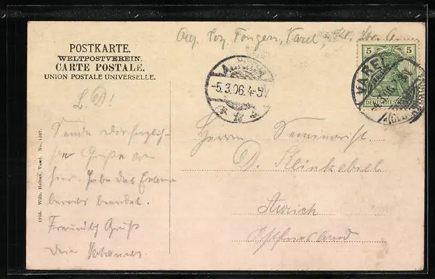 Personenbezogene Daten auf der Rückseite der Karte wurden durch blauen Textmarker unkenntlich gemacht. Die blauen Stellen sind auf die Vorderseite durchgeweicht und wirken sich negativ auf das Postkartenfoto aus