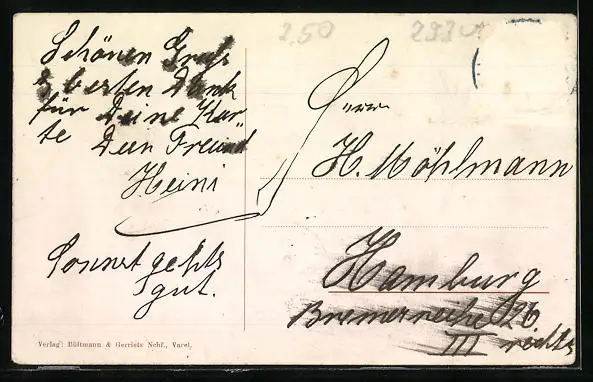 alte Ansichtskarte, gelaufen, Briefmarke entfernt, rückseitig Oberflächenschaden, guter Zustand
