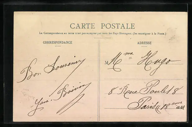 Personenbezogene Daten auf der Rückseite der Karte wurden durch blauen Textmarker unkenntlich gemacht. Die blauen Stellen sind auf die Vorderseite durchgeweicht und wirken sich negativ auf das Postkartenfoto aus