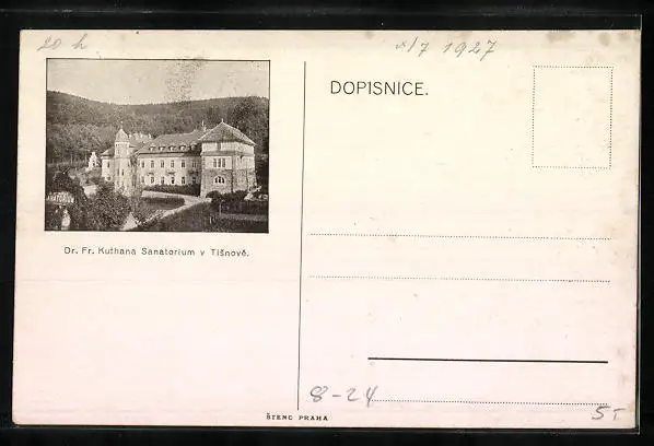 Personenbezogene Daten auf der Rückseite der Karte wurden durch blauen Textmarker unkenntlich gemacht. Die blauen Stellen sind auf die Vorderseite durchgeweicht und wirken sich negativ auf das Postkartenfoto aus
