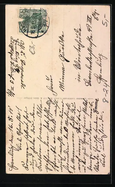 Personenbezogene Daten auf der Rückseite der Karte wurden durch blauen Textmarker unkenntlich gemacht. Die blauen Stellen sind auf die Vorderseite durchgeweicht und wirken sich negativ auf das Postkartenfoto aus