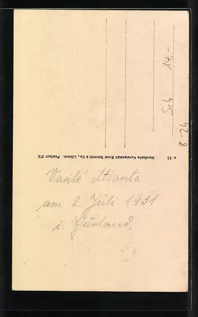 Personenbezogene Daten auf der Rückseite der Karte wurden durch blauen Textmarker unkenntlich gemacht. Die blauen Stellen sind auf die Vorderseite durchgeweicht und wirken sich negativ auf das Postkartenfoto aus