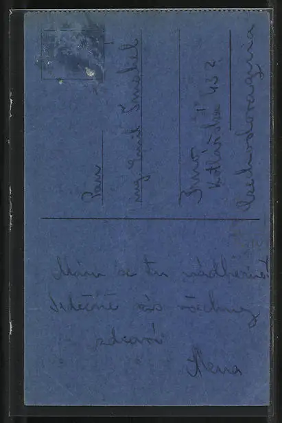 Personenbezogene Daten auf der Rückseite der Karte wurden durch blauen Textmarker unkenntlich gemacht. Die blauen Stellen sind auf die Vorderseite durchgeweicht und wirken sich negativ auf das Postkartenfoto aus
