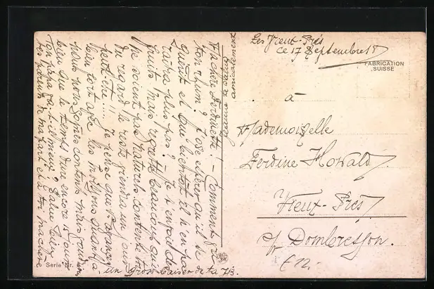 Personenbezogene Daten auf der Rückseite der Karte wurden durch blauen Textmarker unkenntlich gemacht. Die blauen Stellen sind auf die Vorderseite durchgeweicht und wirken sich negativ auf das Postkartenfoto aus