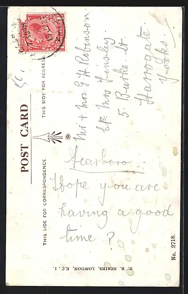 Personenbezogene Daten auf der Rückseite der Karte wurden durch blauen Textmarker unkenntlich gemacht. Die blauen Stellen sind auf die Vorderseite durchgeweicht und wirken sich negativ auf das Postkartenfoto aus