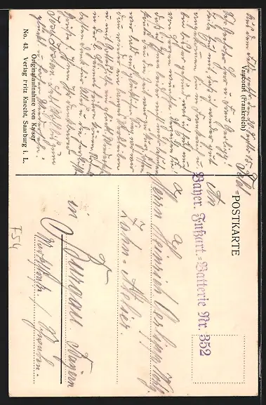 Personenbezogene Daten auf der Rückseite der Karte wurden durch blauen Textmarker unkenntlich gemacht. Die blauen Stellen sind auf die Vorderseite durchgeweicht und wirken sich negativ auf das Postkartenfoto aus