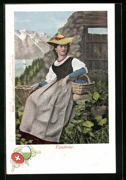AK Vaudoise, Junge Frau in Tracht mit Beerenkorb, Wappen