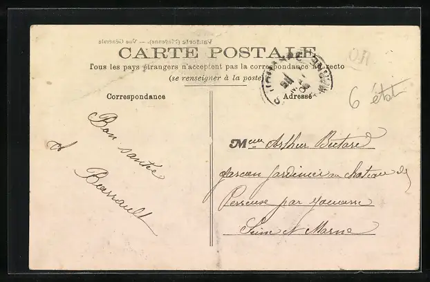 Personenbezogene Daten auf der Rückseite der Karte wurden durch blauen Textmarker unkenntlich gemacht. Die blauen Stellen sind auf die Vorderseite durchgeweicht und wirken sich negativ auf das Postkartenfoto aus