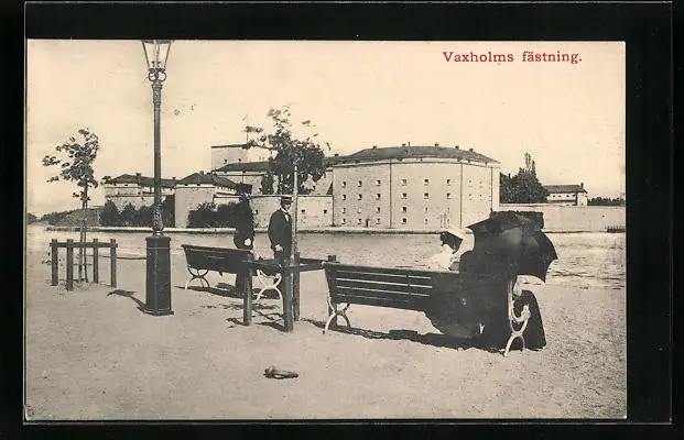 AK Vaxholm, fästning, Passanten am Ufer auf einer Bank
