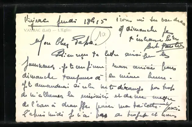 Personenbezogene Daten auf der Rückseite der Karte wurden durch blauen Textmarker unkenntlich gemacht. Die blauen Stellen sind auf die Vorderseite durchgeweicht und wirken sich negativ auf das Postkartenfoto aus