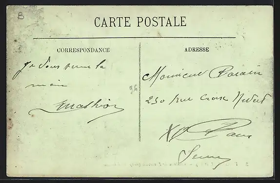 Personenbezogene Daten auf der Rückseite der Karte wurden durch blauen Textmarker unkenntlich gemacht. Die blauen Stellen sind auf die Vorderseite durchgeweicht und wirken sich negativ auf das Postkartenfoto aus