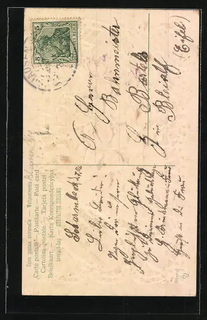 Personenbezogene Daten auf der Rückseite der Karte wurden durch blauen Textmarker unkenntlich gemacht. Die blauen Stellen sind auf die Vorderseite durchgeweicht und wirken sich negativ auf das Postkartenfoto aus