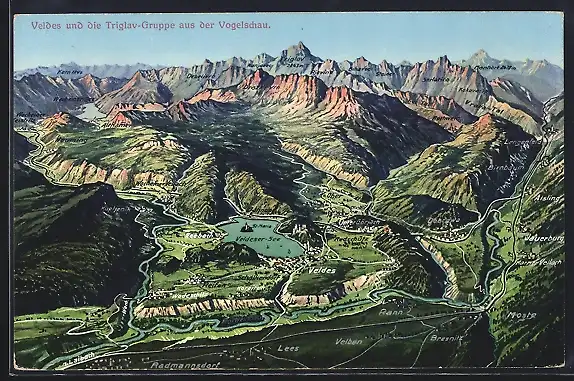 AK Veldes, Ortsansicht mit Triglav-Gruppe aus der Vogelschau
